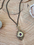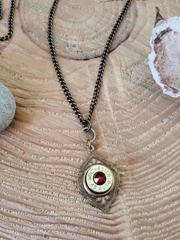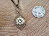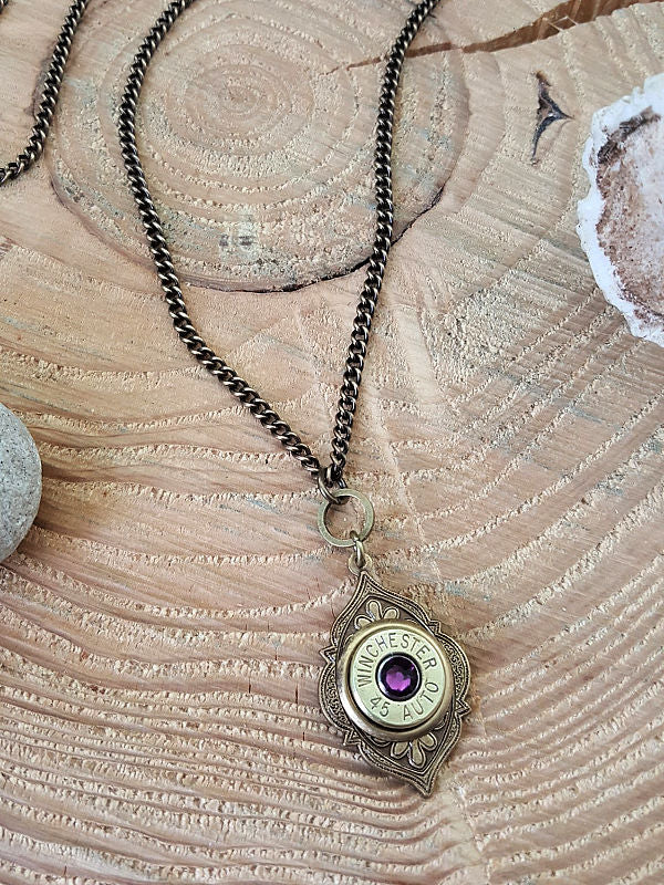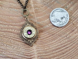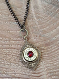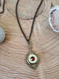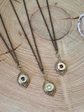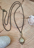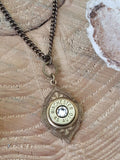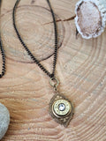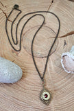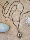 A wonderful solid back brass boho style pendant is mounted with a brass bullet casing set in a matching antique brass bezel. Pendant is not very large, being 33mm x 20mm or 1 1/4" x 3/4", so about the size of quarter. This makes it the perfect addition to your existing layering pieces or you can sport a minimal look by wearing it alone.