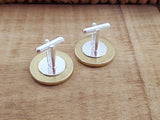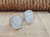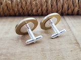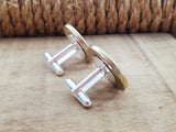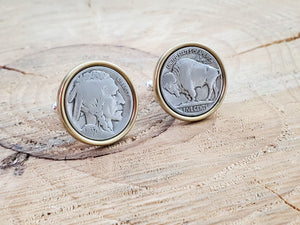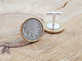 Set in smooth brass bezel cups and secured to silver plate cuff link bases.  Bezels hold the nickels and protect the clothing while offering a mixed metal look lending character, added interest and dimension.