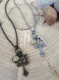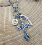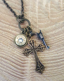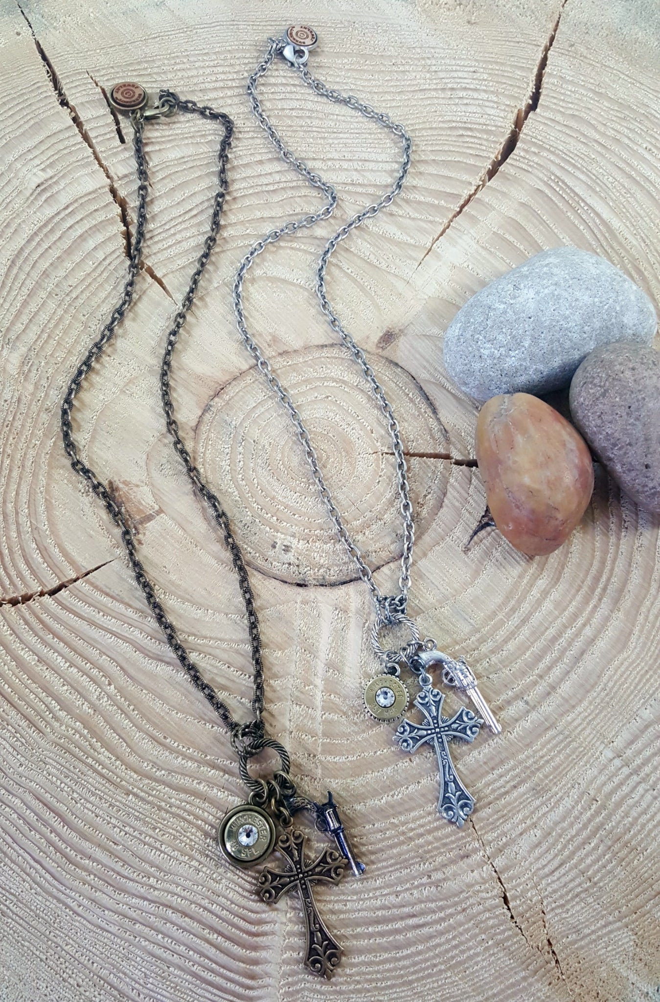 VERSATILITY is the best word to describe this necklace.  Offered in either antique brass or antiques silver components. The necklace includes a brass bullet casing (calibers will vary) set in a solid backed bezel, with our signature pistol charm and detailed crucifix. Hung at just the right lengths from solid rope ring and suspended from an 18" standard length cable chain.