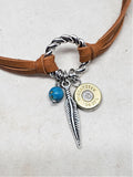 Hung from the ring is a genuine 6mm turquoise bead, a detailed feather charm and genuine brass bullet casing charm, mounted in a stainless steel bezel.