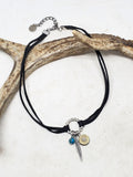 We knotted the lace through each side of a thick antique silver rope textured ring. The ends are finished with stainless steel crimps and lobster clasp. Included is an extender chain using our antique silver curb style to accommodate most neck sizes.