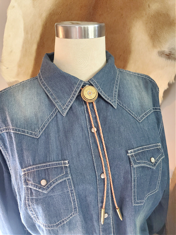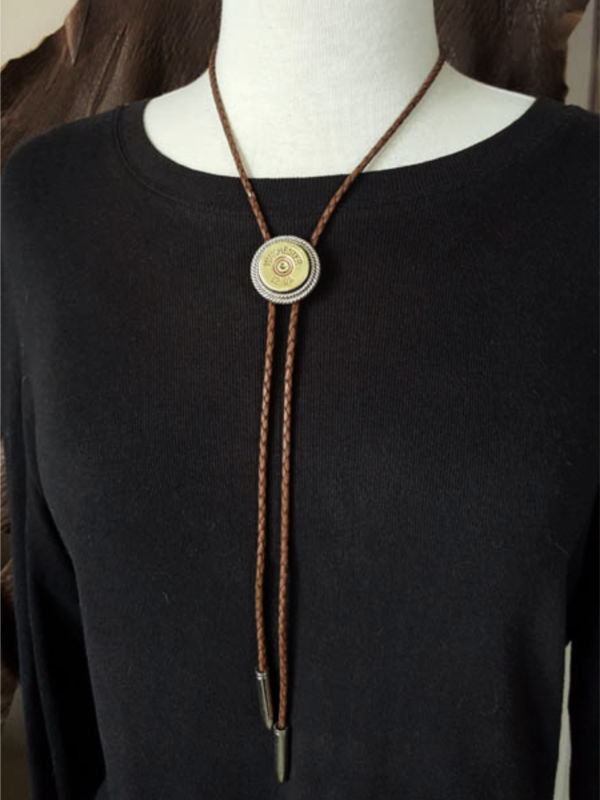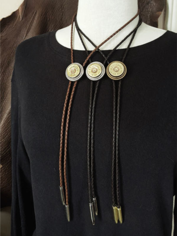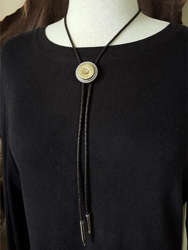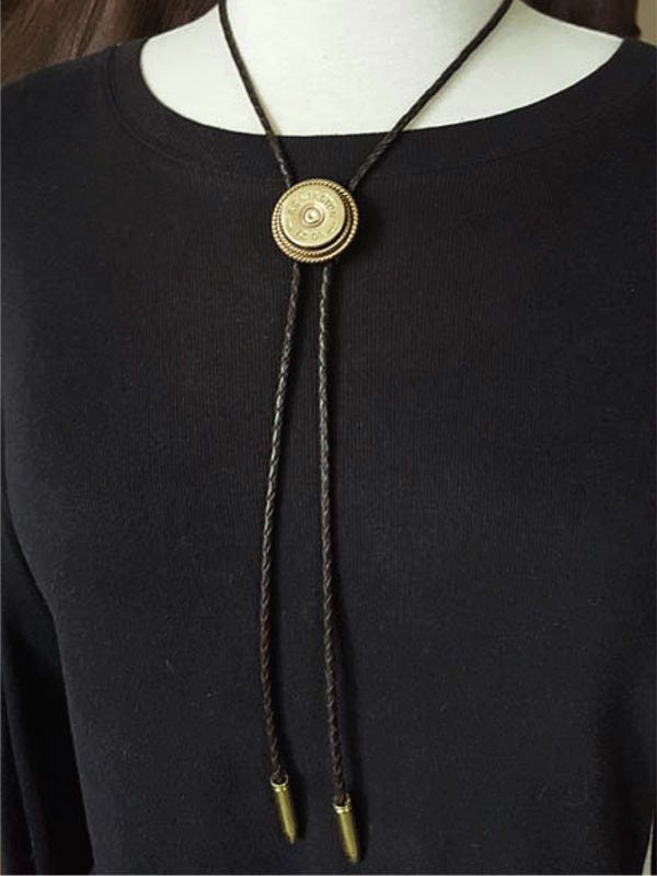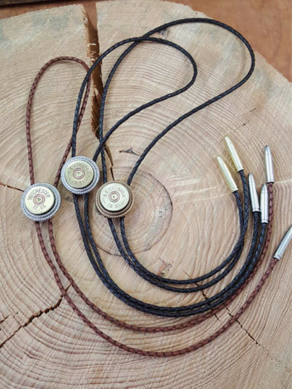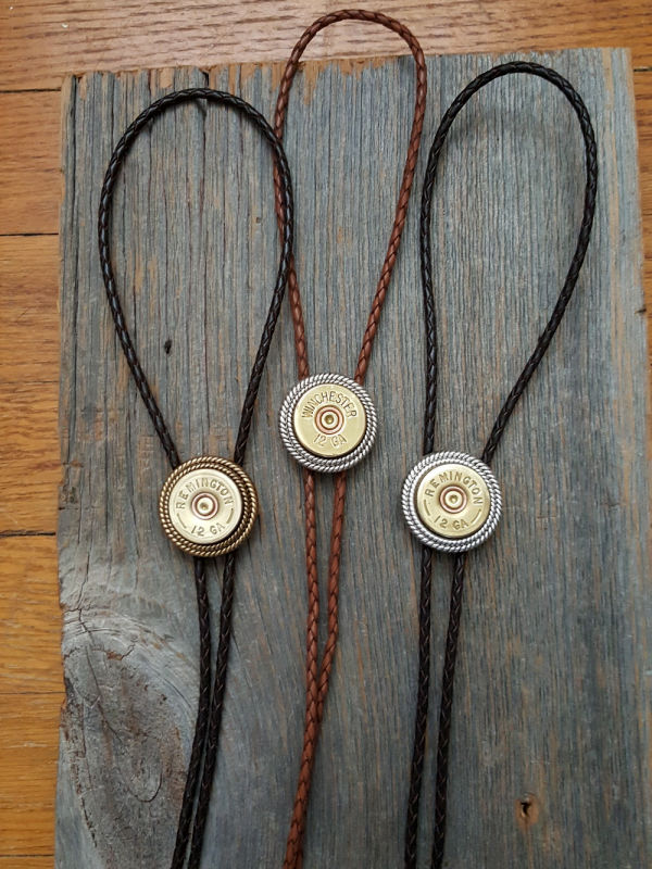 This style features a brass 12 gauge shotgun casing double mounted in our signature rope bezels.  We double mounted the casing for quality, character and dimension.  Matching bullet shape bolo tips carry out the theme.