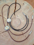 Choice of antique silver or antique brass components.  Braided genuine leather cord in your choice of Black, Saddle, Dark Brown or our newest added color:  Buff/Beige.  Use dropdown to make your selections.