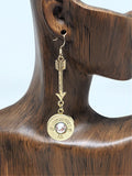 Antique gold arrows that are solid and two-sided, hang from gold over stainless French wires while suspended below are gold over stainless bezels mounted with brass 20 gauge shotgun casings.