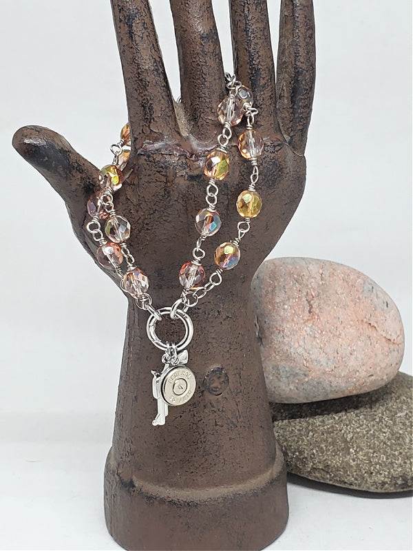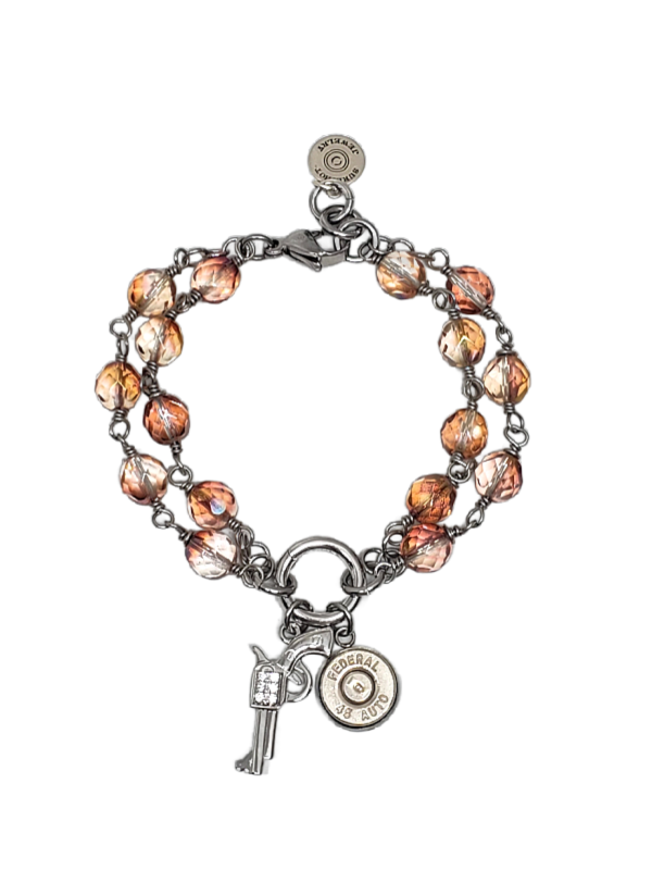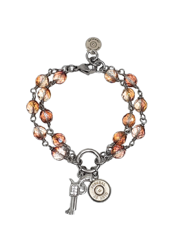 Elevate your style with double strands of sparkling faceted peachy pink fire polish beads linked by a stainless steel versatile circle clip adorned with a nickel bullet casing and a dazzling CZ embellished pistol charm. Perfect for showcasing your passion for the gun-loving lifestyle, this bracelet features beautiful peachy pink glass beads that glisten in the light. The delicate shades offer a gentle juxtaposition, making this a must-have accessory.