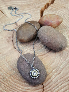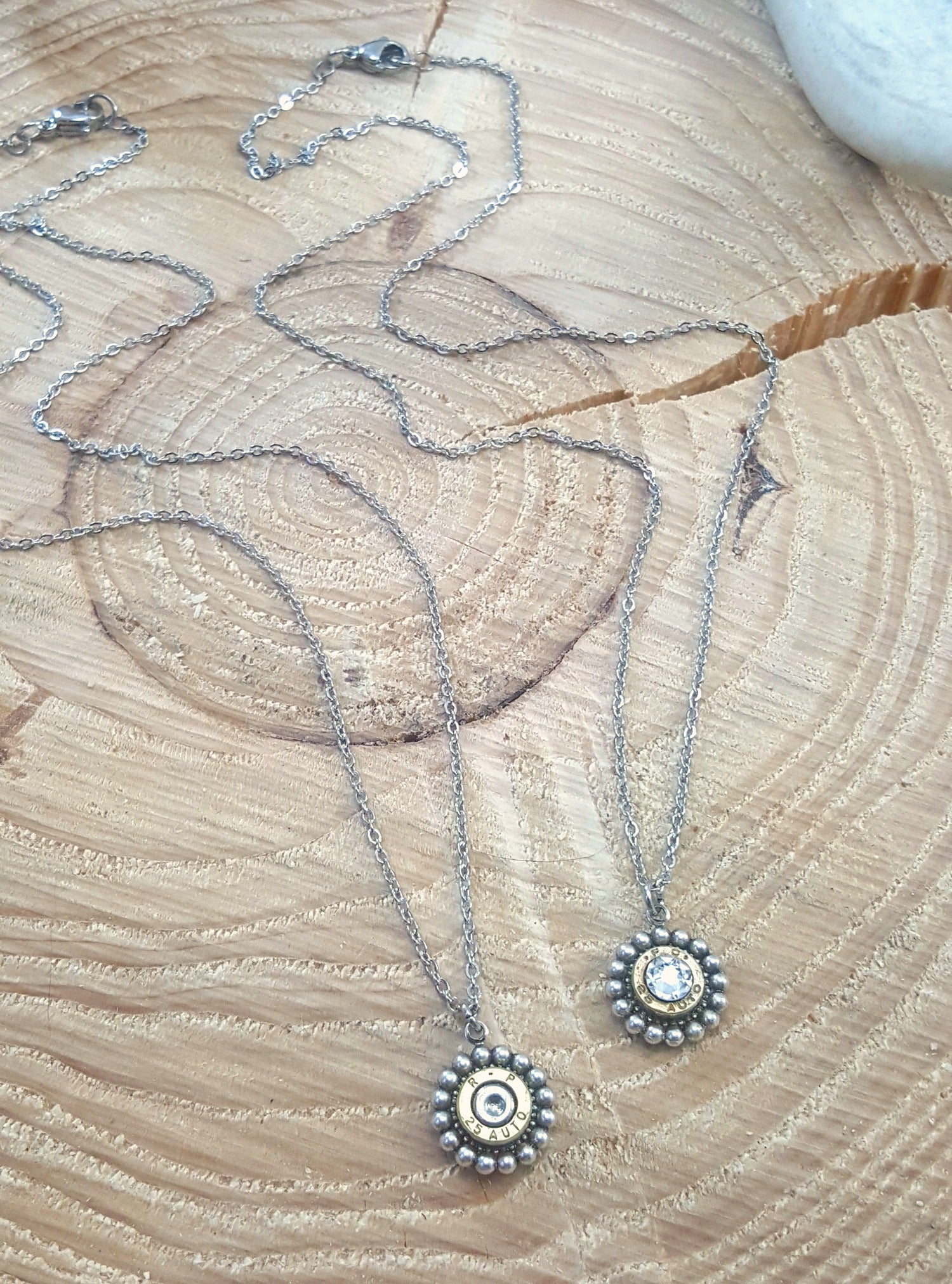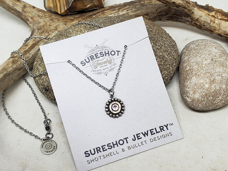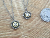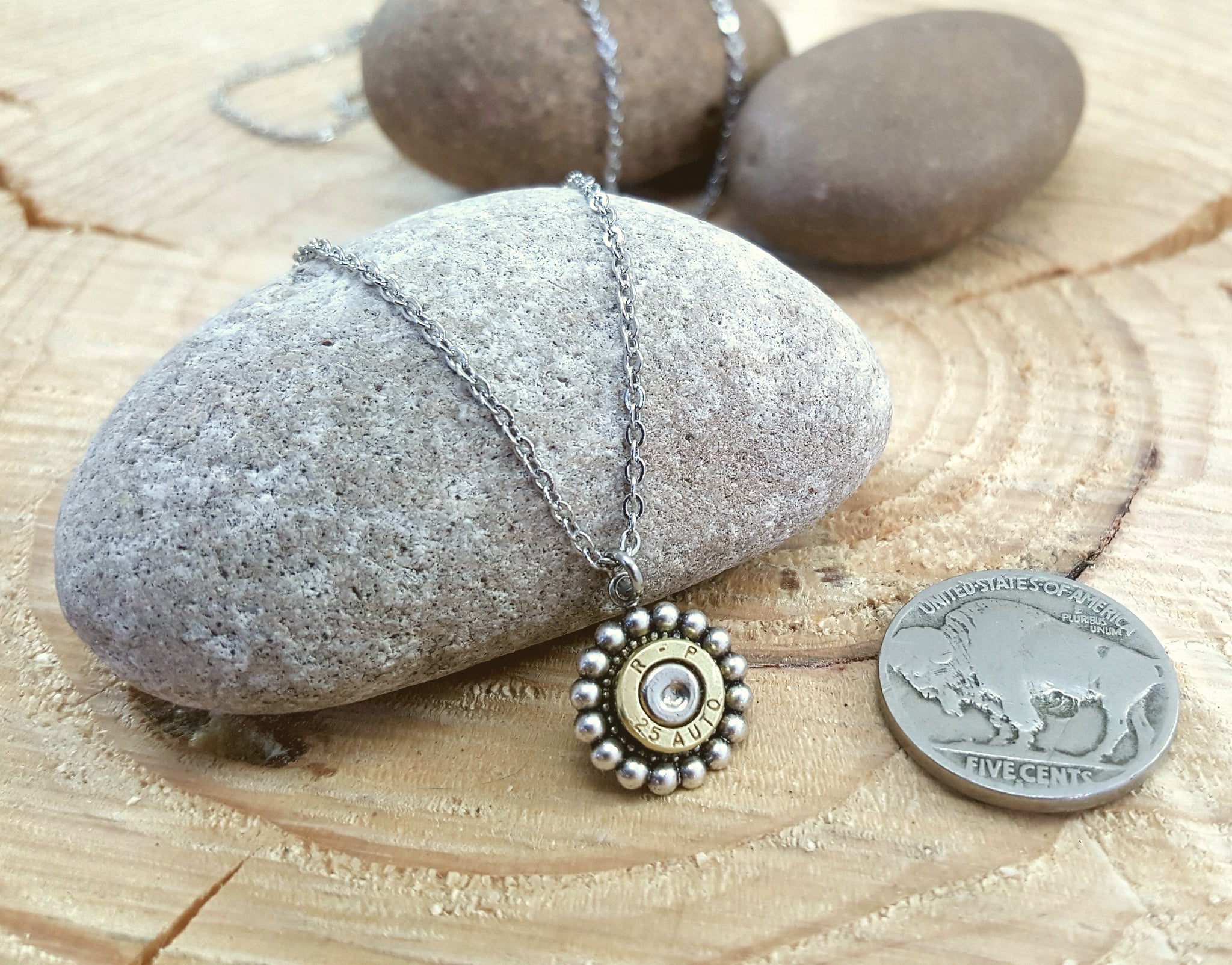 This pendant is a beaded bezel in antique silver and holds a small 25 auto bullet casing in the center.