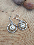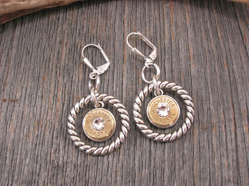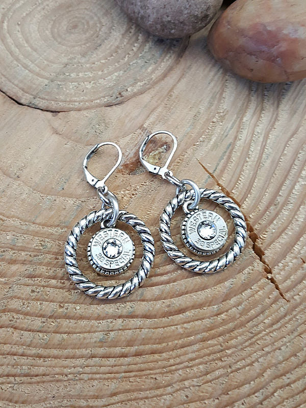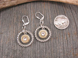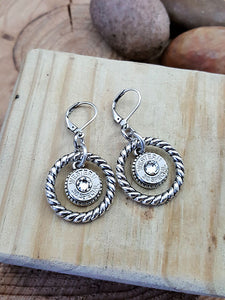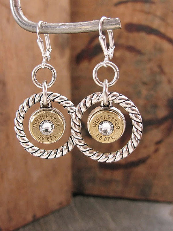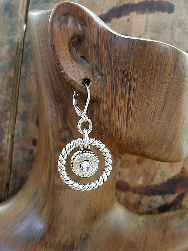 Bullet casings in your choice of brass or nickel are set in silver pewter type loop bezels that are the perfect diameter to be suspended inside of these pretty rope rings. The result is a stylish and modern pair of dangles that have a western flair.