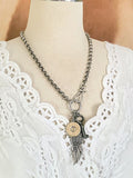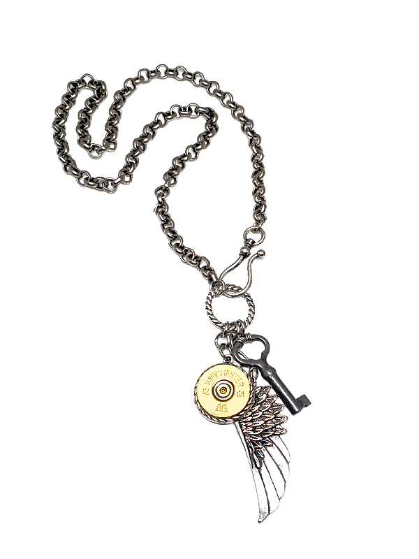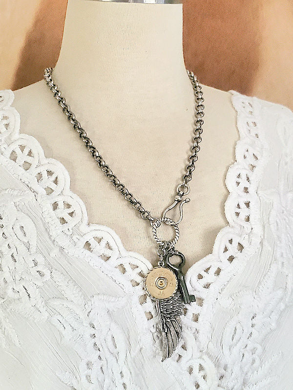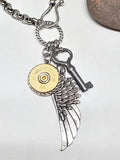 Genuine antique skeleton key, 12 gauge shotgun casing and large wing pendant come together to create this very hip charm necklace!