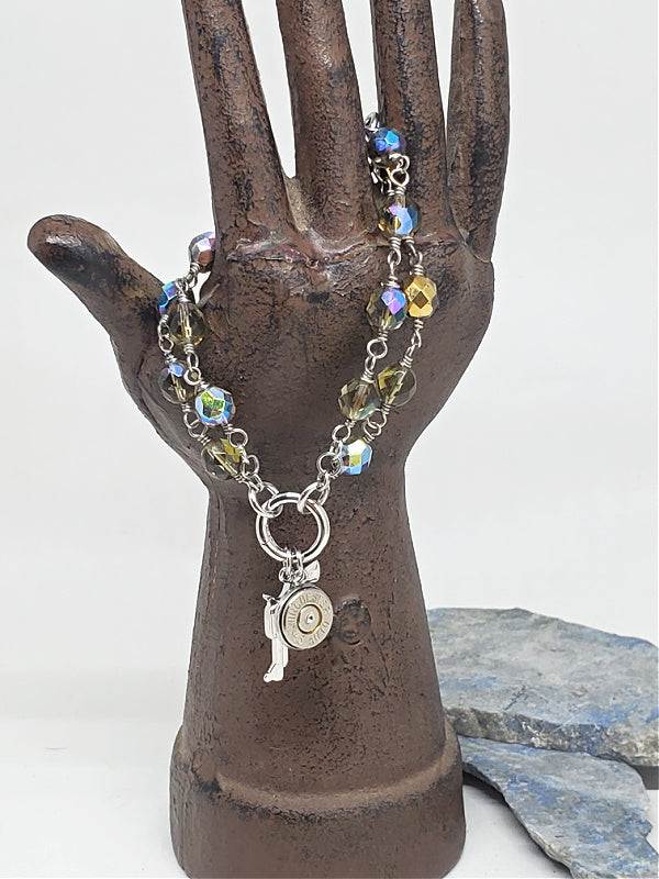 Elevate your style with double strands of sparkling faceted aurora borealis fire polish beads linked by a stainless steel versatile circle clip adorned with a nickel bullet casing and a dazzling CZ embellished pistol charm. Perfect for showcasing your passion for the gun-loving lifestyle, this bracelet features beautiful smokey color glass beads that glisten in the light with a rainbow of hues as only aurora borealis can do. The multitude of shades make this a versatile accessory for your jewelry collection.