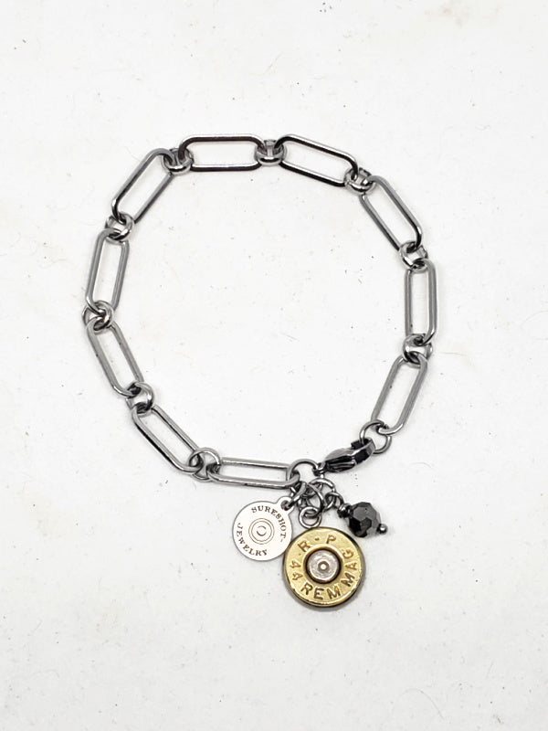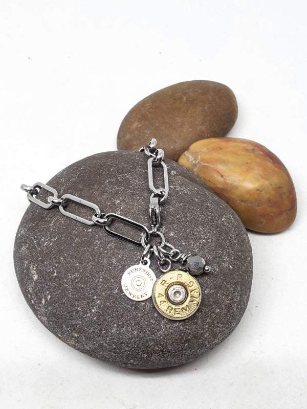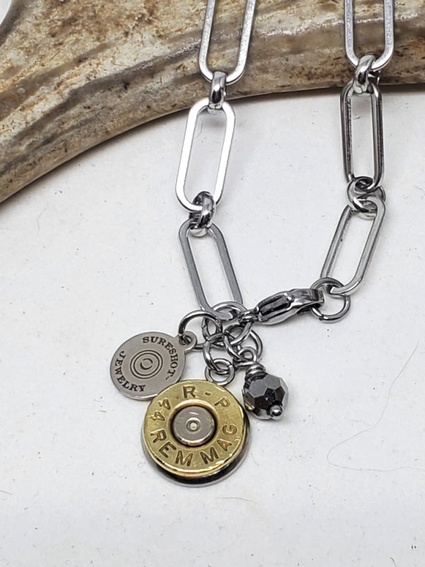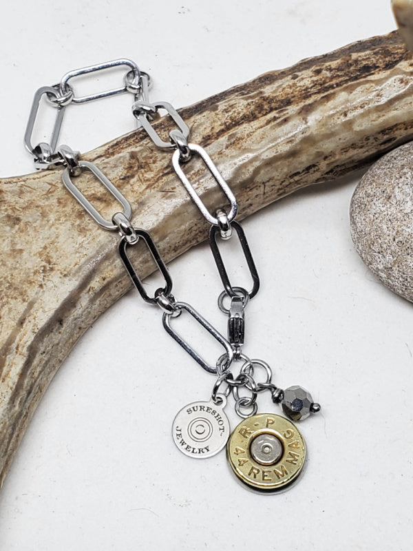 Our STAINLESS STEEL version is a lightweight link style and features a brass bullet casing set in a stainless bezel, flanked with a coordinating silver/gray faceted bead and our signature logo charm.