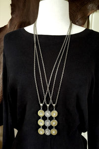Our triple 9mm stacked necklace has been a favorite for years so we decided to ramp it up in size by creating a larger version using 20 gauge shotgun casings and styling the necklace as a long length design instead.