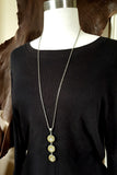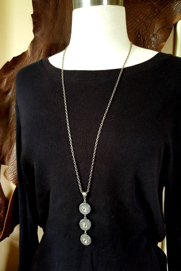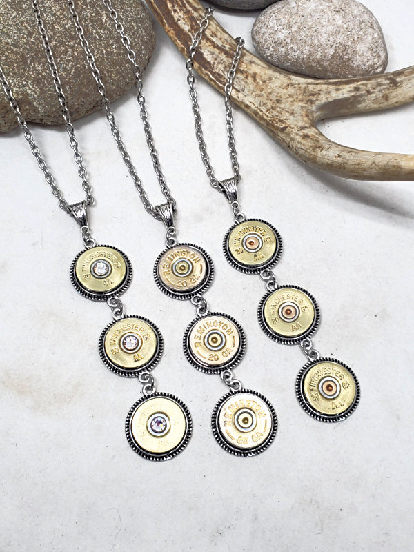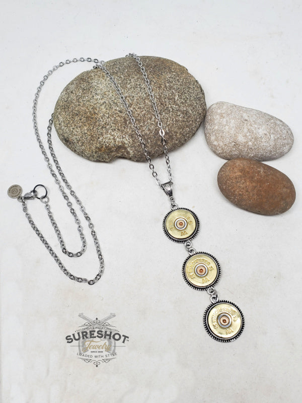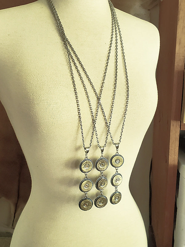 Three 20 gauge shotgun casings are set in flat back bezels and attached in a stacked pattern.  Chain is stainless steel cable chain.  Comes with a lobster clasp, but with the generous length, you can simply slip it over your head and go.