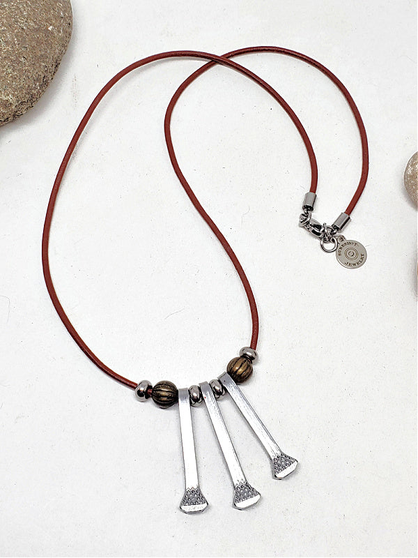 This necklace design is one that can be worn by men or women.  It uses three horseshoe nails* as a trio with stainless steel and antique brass beads in between.