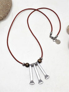 My idea for this necklace came when, fresh from the horse barn of our old farmhouse, I salvaged an old coffee can of horseshoe nails. There was even a little straw mixed in!  This was the inspiration for creating horseshoe nail jewelry in my own styles.  Because of the popularity of all of the designs that I now create, the coffee can was long emptied and I now source horseshoe nails from big barns to continue creating these best sellers.  The nails are often new old stock.