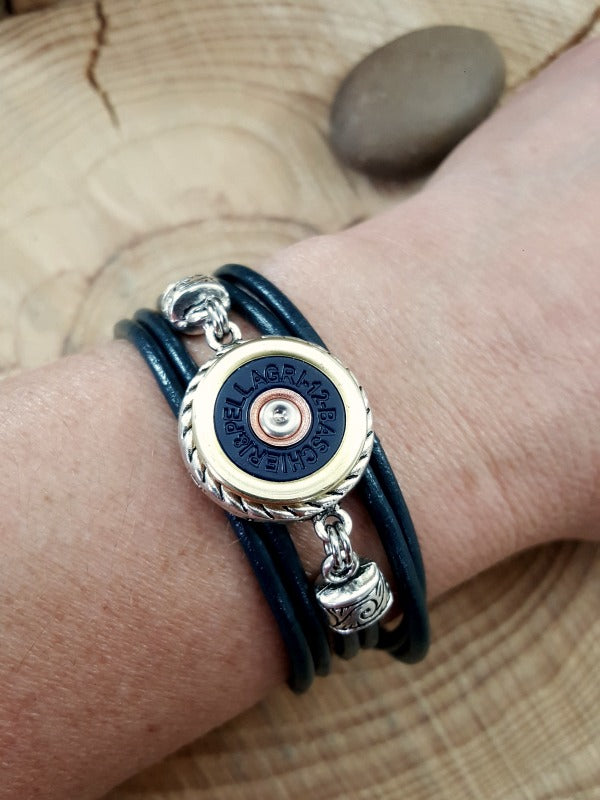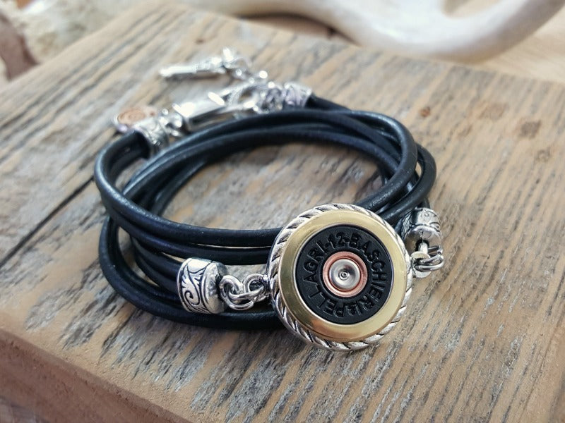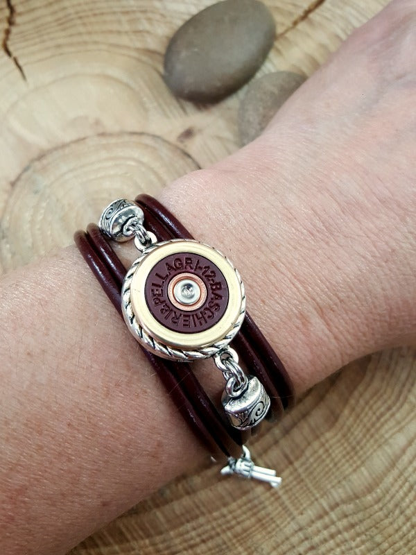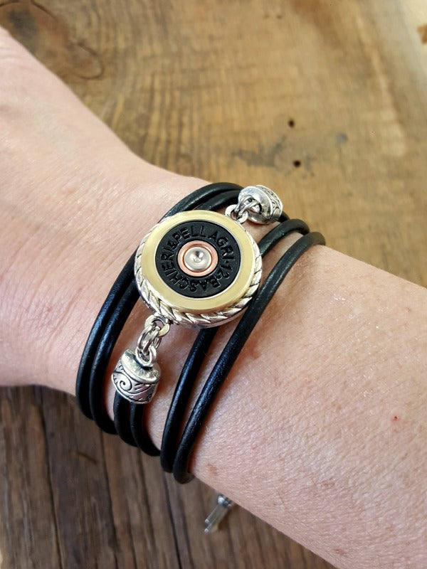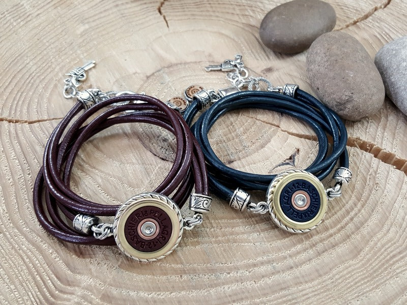 Beautiful Italian manufactured Baschieri & Pellagri brand 12 gauge shotshells are incorporated into these triple wrap leather bracelets.