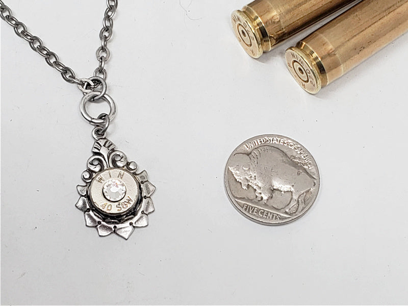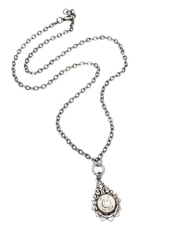 We love the look of this vintage style antique silver pendant. It has the perfect based to nestle a small caliber bullet casing to make this pretty necklace that has a vintage appeal.